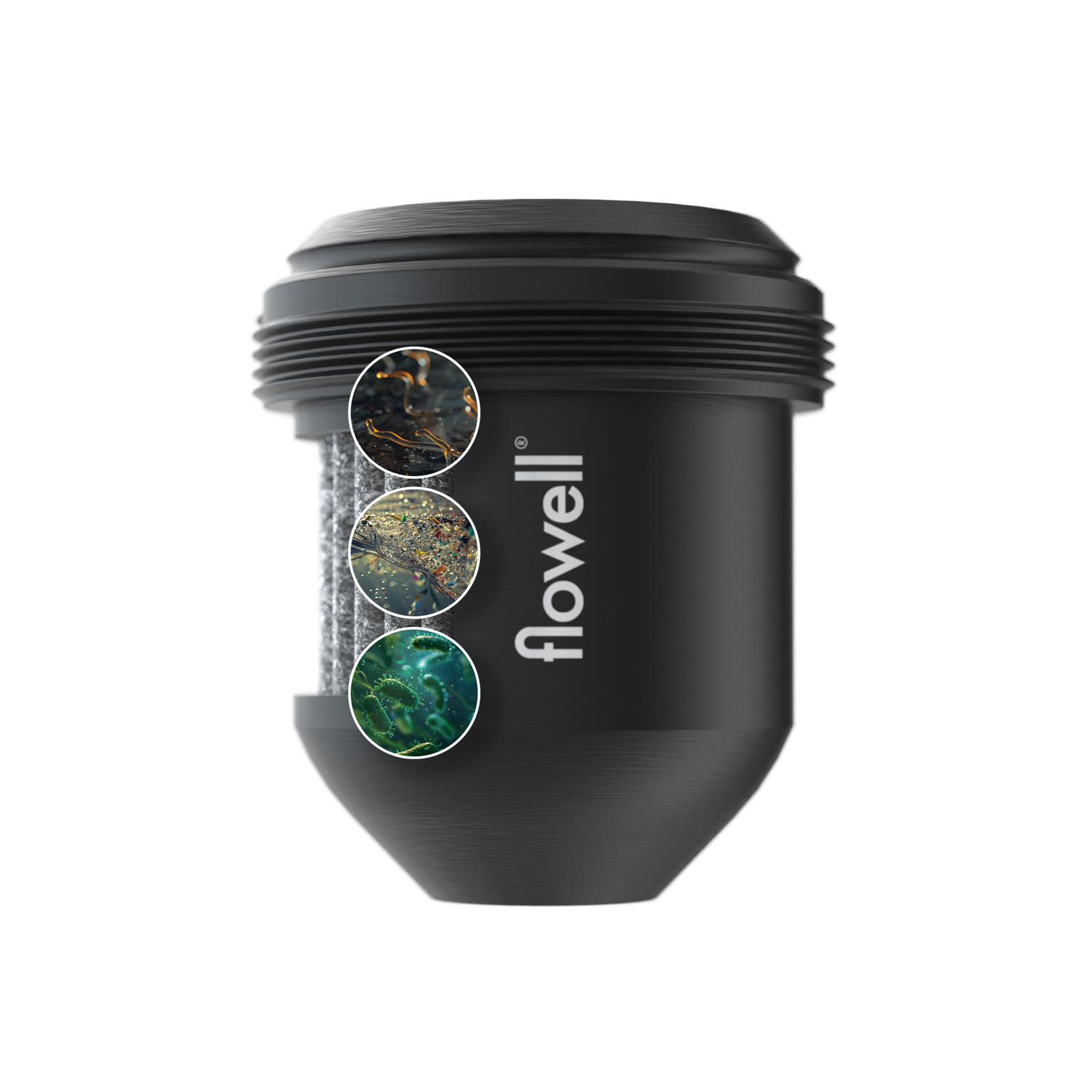 flowell leitet das Wasser zunächst durch eine Schicht aus Aktivkohle, die feinste Teilchen anzieht und bindet. Die Oberfläche der Aktivkohle ist mikroskopisch porös, sodass die ungewünschten Teilchen wie u.a. Chlor, Chemikalien, Bakterien und Gerüche an ihrer Oberfläche schlichtweg hängenbleiben. Im nächsten Schritt fließt das Wasser durch unsere spezielle Membran, die alle weiteren Fremdkörper extrahiert.